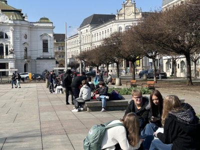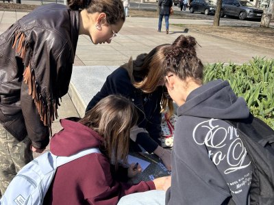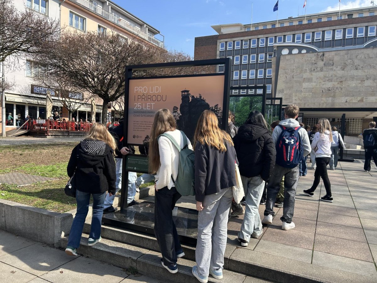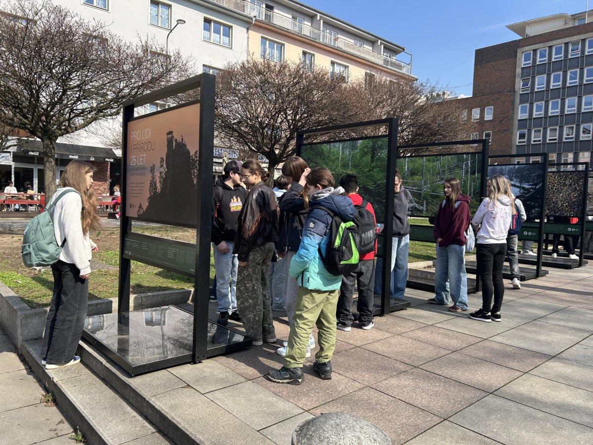 Po workshopu se třída přesunula na Lidické náměstí, kde si žáci prohlédli exteriérovou výstavu velkoformátových fotografií zachycujících vývoj krajiny po rozsáhlém požáru v Národním parku České Švýcarsko. Fotografie je inspirovaly k diskusi o obnově přírody, významu chráněných území i o tom, jak se krajina mění vlivem člověka a přírodních událostí.