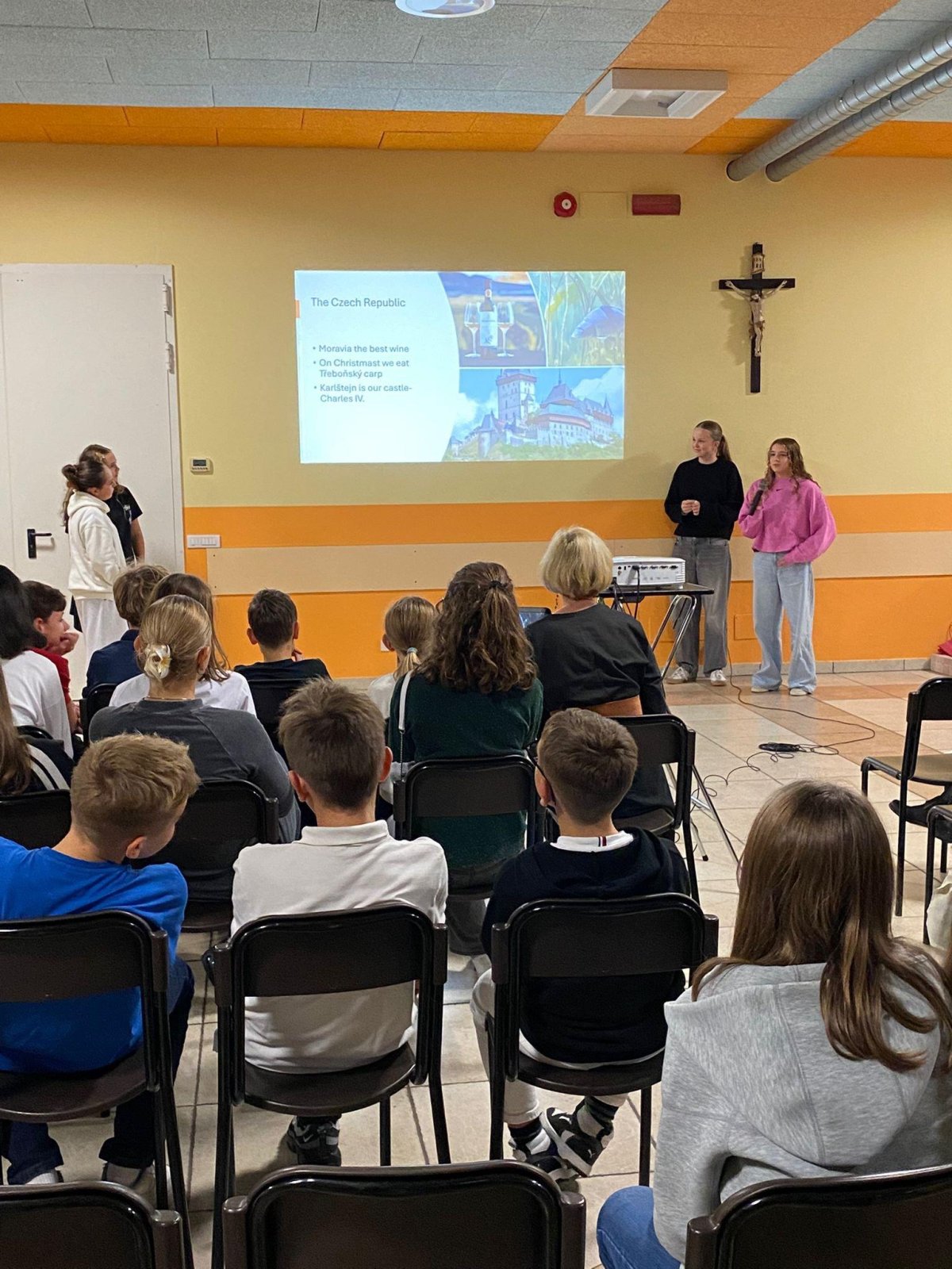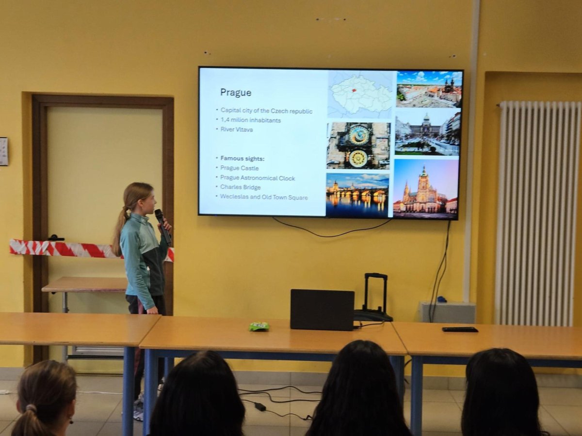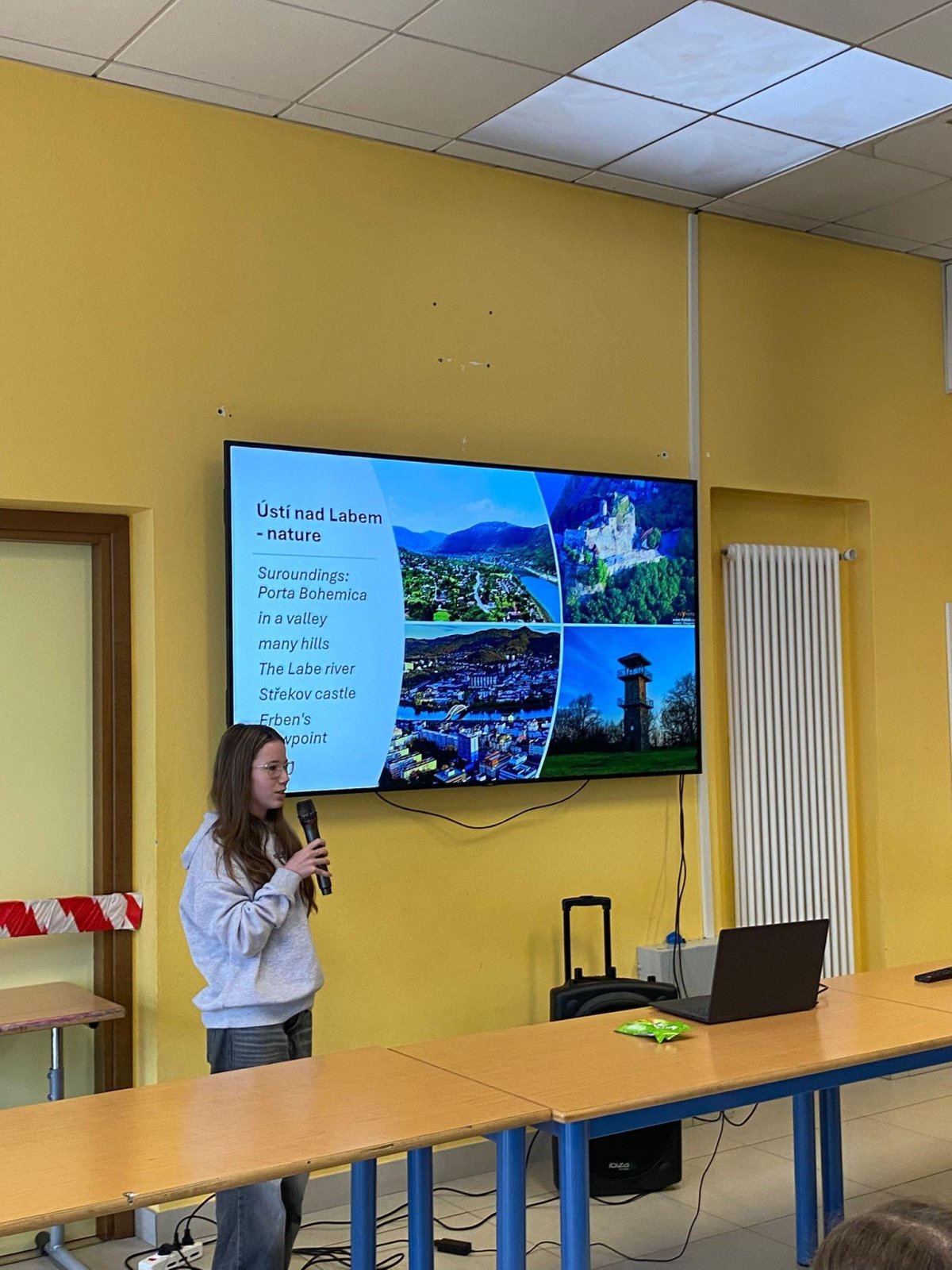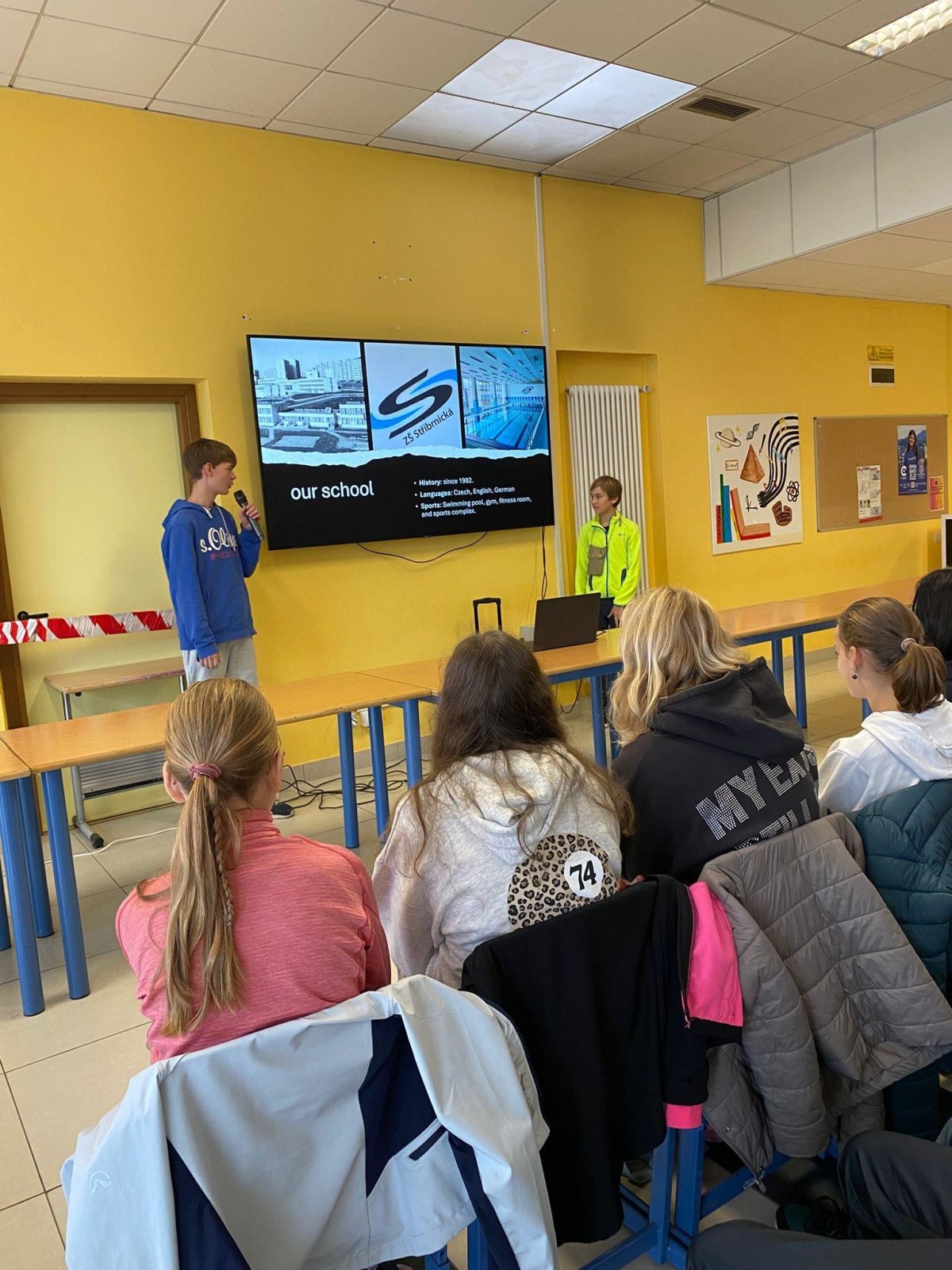 Dopoledne představili naši žáci Českou republiku, město Ústí nad Labem i naši školu. Italští kamarádi nám zase ukázali, jak tvoří své přírodovědné projekty. Společně jsme pak porovnávali čtyři evropské jazyky – angličtinu, italštinu, češtinu a němčinu. Smíchu bylo dost, protože čeština dala našim italským přátelům pořádně zabrat!