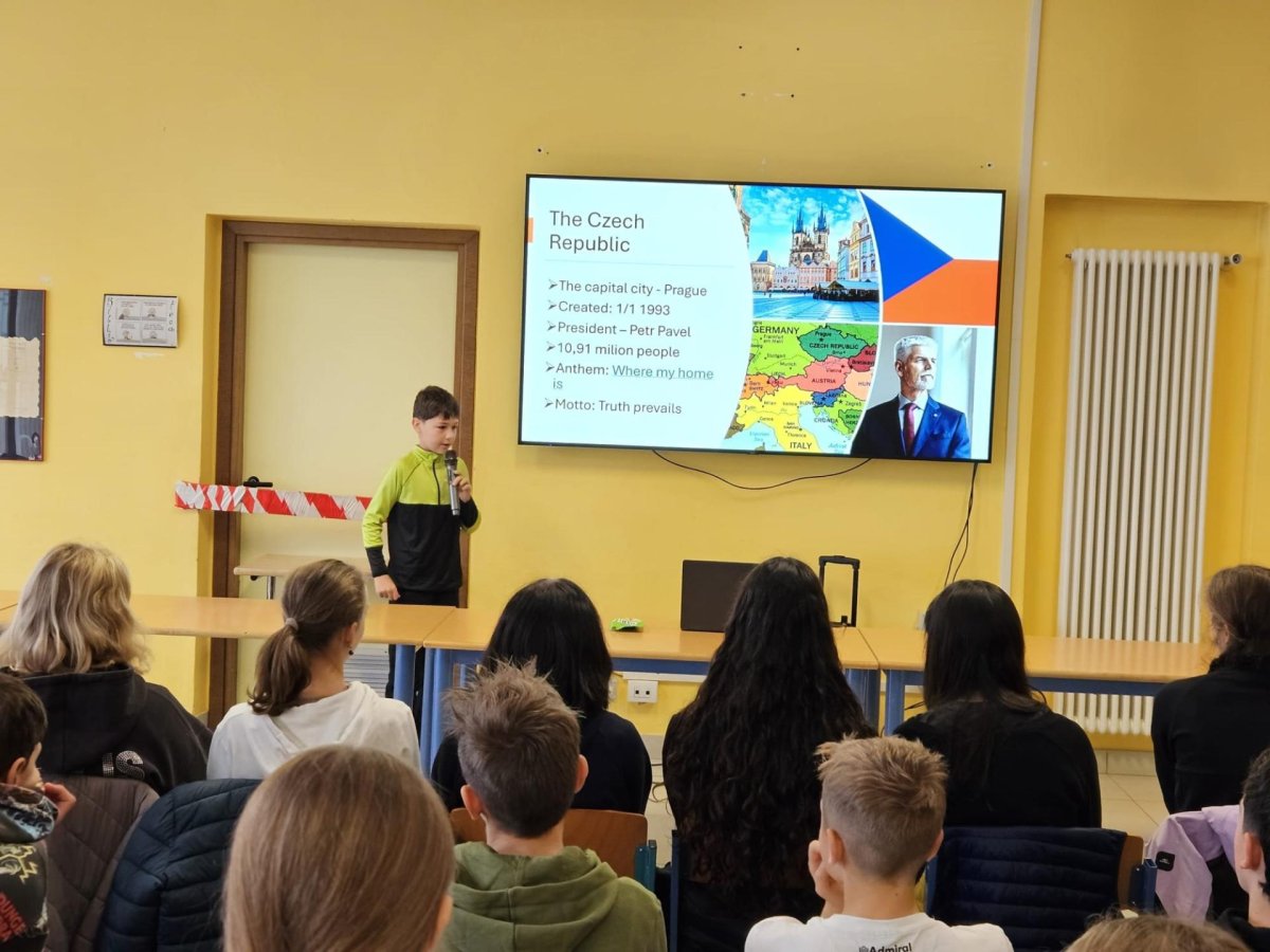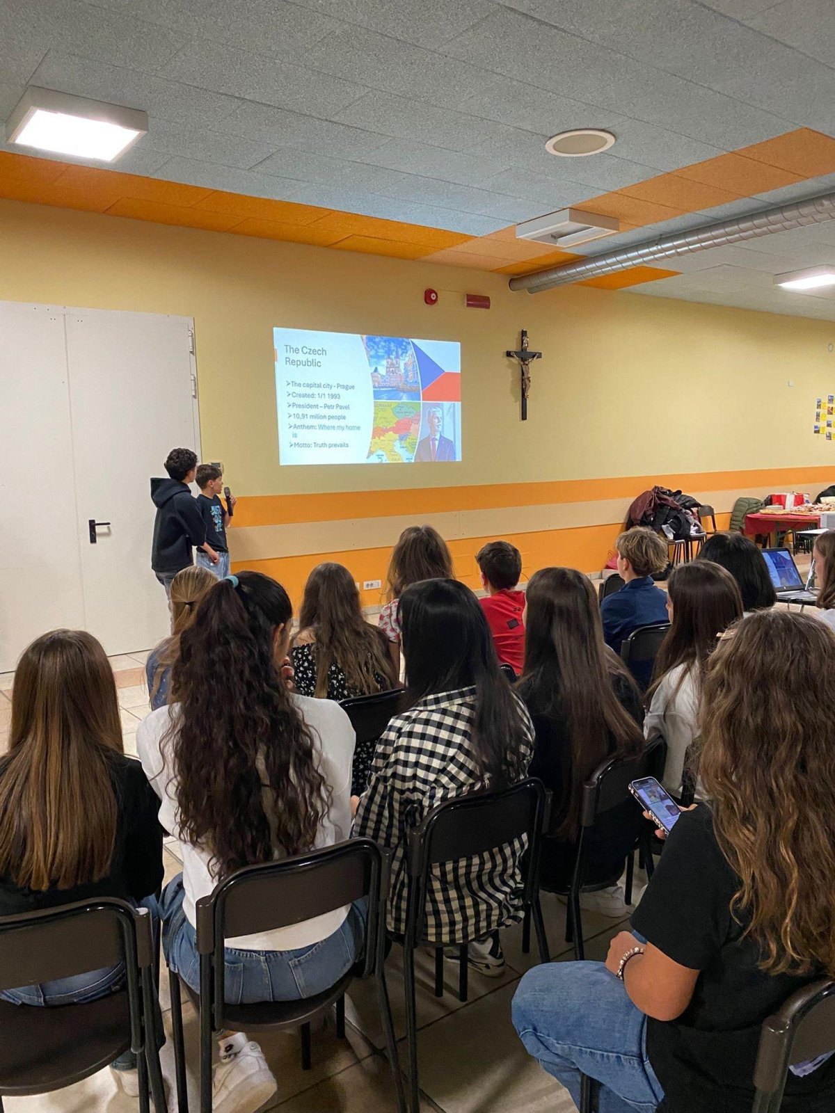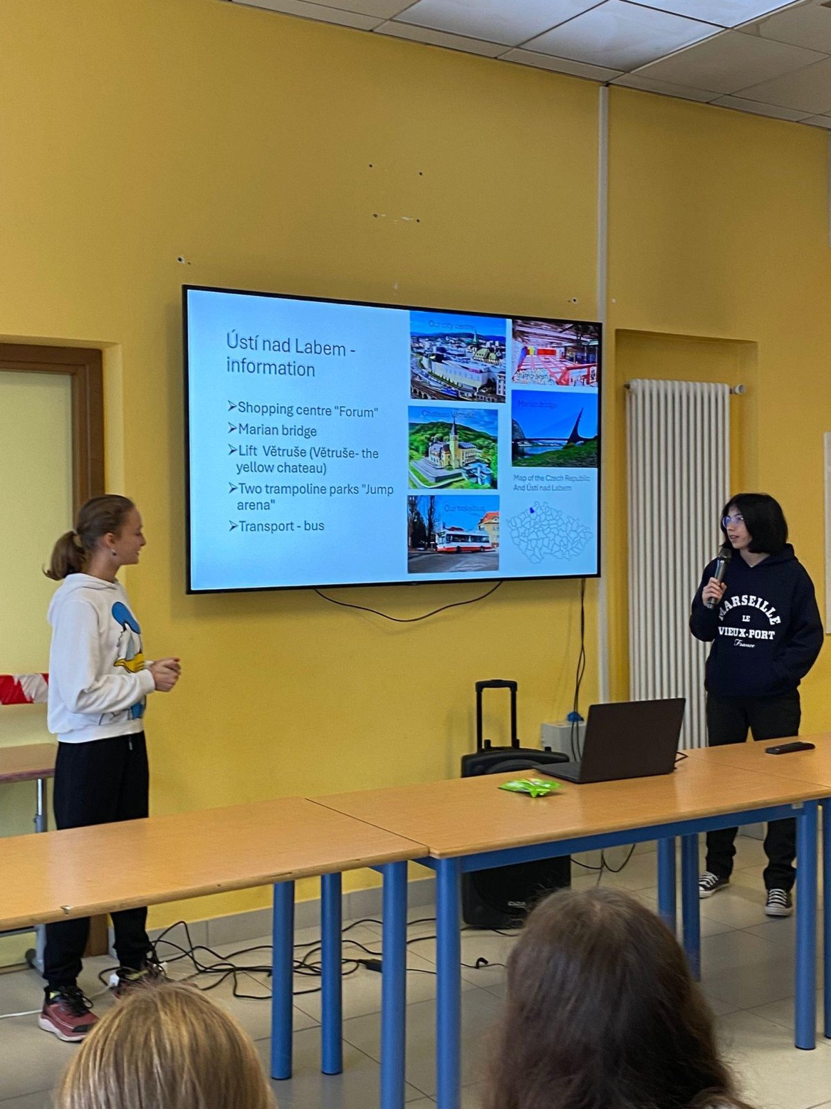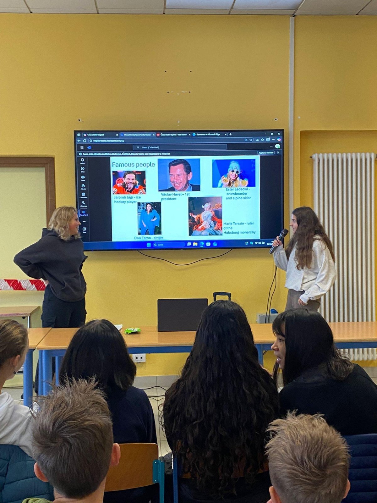 Dopoledne představili naši žáci Českou republiku, město Ústí nad Labem i naši školu. Italští kamarádi nám zase ukázali, jak tvoří své přírodovědné projekty. Společně jsme pak porovnávali čtyři evropské jazyky – angličtinu, italštinu, češtinu a němčinu. Smíchu bylo dost, protože čeština dala našim italským přátelům pořádně zabrat!