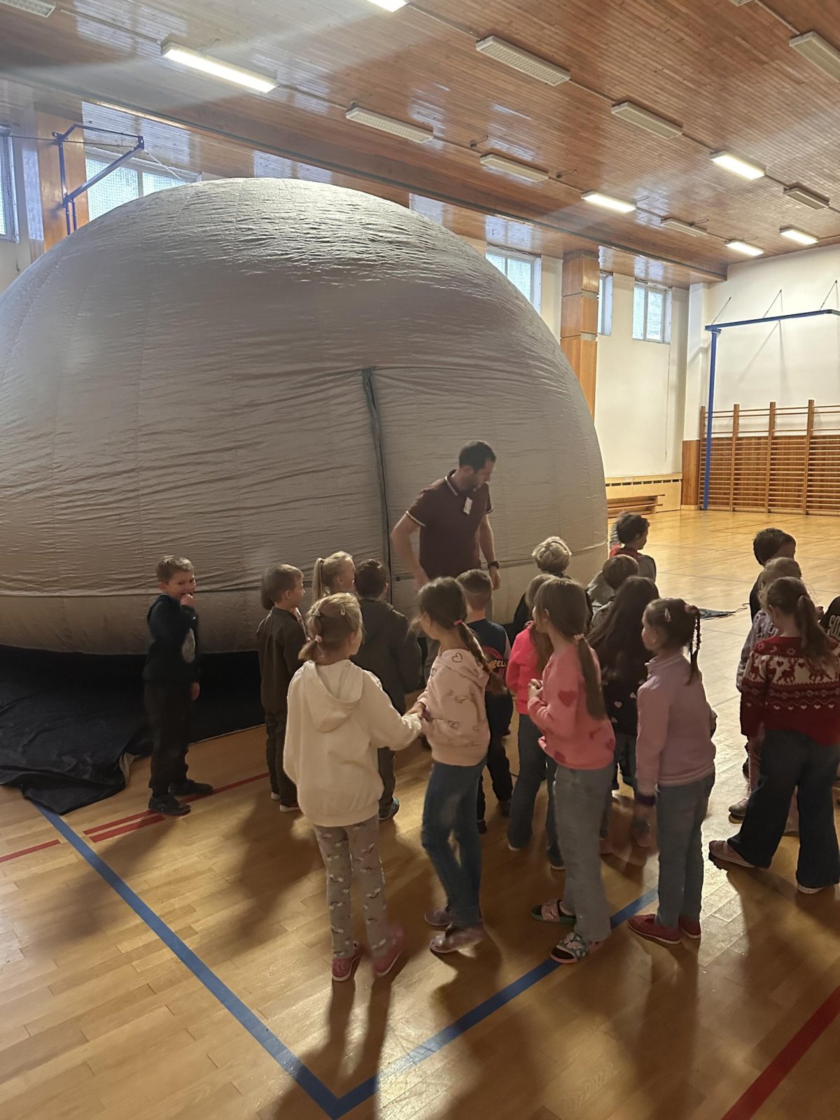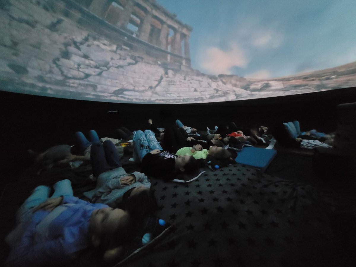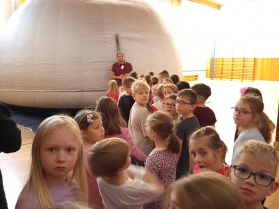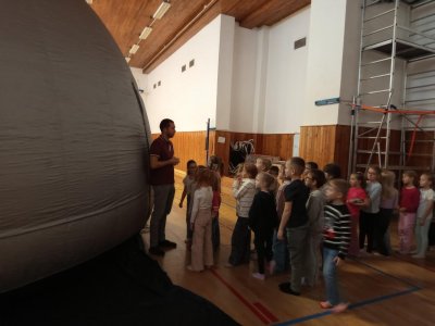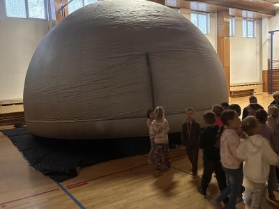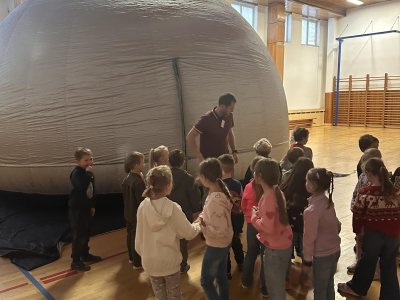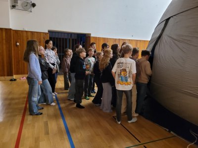 Ve středu 12. a ve čtvrtek 13. listopadu 2025 měly děti z prvního stupně jedinečnou příležitost zhlédnout vzdělávací filmy v pojízdném planetáriu. Projekce probíhaly přímo ve škole, kde nafukovací kopule vytvořila atmosféru skutečné hvězdárny.